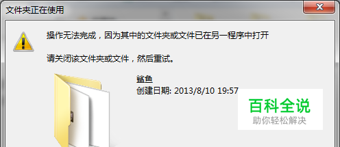 如何解决Win7系统在删除或移动文件时提示,“操作无法完成,因为其中的文件夹或文件已在另一个程序中打开,请关闭该文件夹或文件,然后重试”。