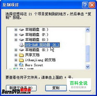 第2步,打开“复制项目”对话框,单击选中DVD刻录机盘符,并单击“复制”按钮即可,如图2009011708所示。 图2009011708 单击“复制”按钮