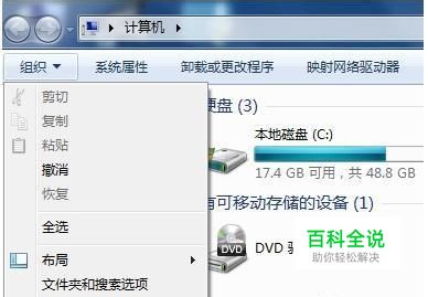 2.单击组织,出现下拉菜单,点击文件夹和搜索选项。如图: