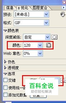 用Adobe ImageReady CS2打开需要压缩的gif格式店招图片。 在右上角的优化窗口设置图片颜色和损耗。颜色可以在128、256之间选择,损耗建议在1-40内。