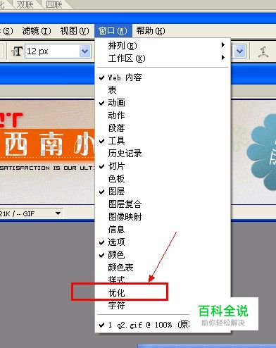 如果没有看到这个优化窗口,你可以在Adobe ImageReady CS2的菜单依次点“窗口”-“优化”打√调出优化窗口。