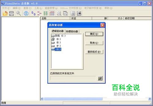 1、首先点最左边那个“文件夹”图标,会弹出一个“选择驱动器”窗口,选择要恢复数据的硬盘,就是删除的文件所在的那个硬盘,比如我的G盘。你应该知道在哪个硬盘吧?要是忘记了,就每个盘都扫描吧。