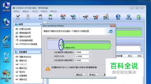 现在来缩小(即压缩)F盘到15.90GB,在F盘上右击在弹出的菜单中选择“调整/移动分区”选项,然后你将看到如图2所示的窗口,向右拖动左边的手柄以缩小F盘15.90GB。