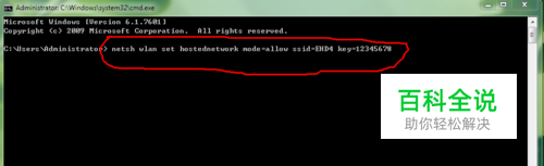 输入以下命令: netsh wlan set hostednetwork mode=allow ssid=EHD4 key=12345678 (其中 EHD4是你想创建的无线的名 12345678 是密码)