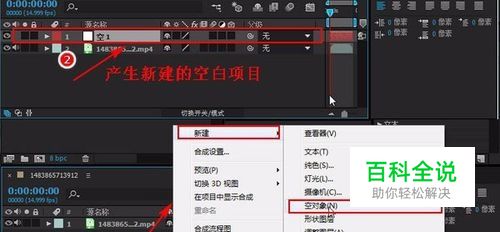 接着在视频文件下方空白处右击,在弹出的菜单中选择“新建”后面的“空对象”,紧接着就会在视频上面出现一个名为“空1”的空白项目。就和我下面展示图的效果是一样的,这个空白对象是非常重要的,不要忘记新建了。