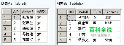 (二). 比较使用 EXISTS 和 IN 的查询。注意两个查询返回相同的结果。 select * from TableIn where exists(select BID from TableEx where BNAME=TableIn.ANAME) select * from TableIn where ANAME in(select BNAME from TableEx)