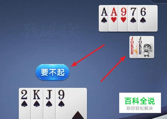 对方出了A后,我们要不起,但他还有7和9,在出7时,我们出K就顺利过关了。