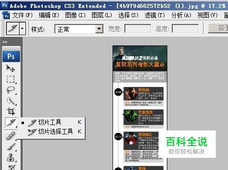 启动PS,打开你要想分割的图片。点击工具栏中的切片工具 然后在打开的图片上点击鼠标右键,选择“划分切片” 在“水平划分”与“垂直划分”栏中输入你想要的数值,要是想把图片平均划分为4片,就在水平划分栏输入2,在垂直划分栏输入2(2*2=4片)。 然后点击文件--存储为web和设备所有格式,在随后弹出打开的存储预设对话窗口中选择存储的图片格式类型与图片质量,然后点击存储,然后再选择保存路径,在文件名一栏写上文件名,在保存类型一栏选择“仅限图像”(如果你不是做网页的话)即可。