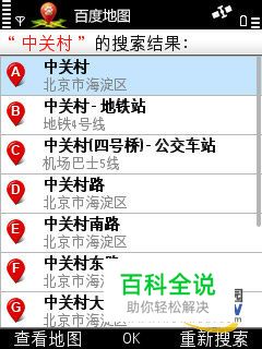 作为以搜索引擎起家的百度,搜索依然被放在显要位置,也更明确了百度手机地图的搜索功能的强劲性能。只要在地址栏中输入一个地址,然后在结果中,显示了包括该地点的地铁站、公交车站等其它信息,如中关村地铁站、中关村公交车站等。 在搜索结果中,用户只要按OK键,就能打开该搜索地点的详细信息,比如说该地点的公交车行驶方向、早晚班的时间,还有附近的商场、学校、办公大厦等。