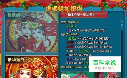 结婚方法 男女二人组队到洛水城【月老】处对话,选择【我要结婚】,满足条件的情况下选择一种规格的婚礼完成即可。