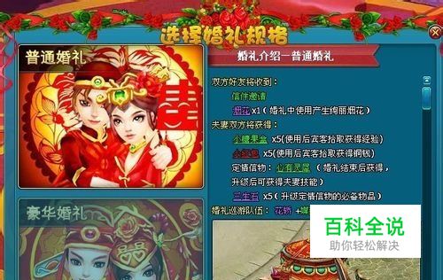 婚礼规格 目前开放两类婚礼规格, 【普通婚礼】和【豪华婚礼】,不同婚礼规格获得的物品不同。 普通婚礼 豪华婚礼