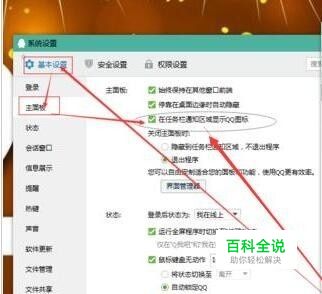 首先我们打开QQ主界面,在左下角有一个齿轮标志的按钮设置键,点击齿轮,进入设置。在基本设置中,左侧选择主界面,右侧显示有一个“在任务栏通知区域显示QQ图标”,前面小方框中点击一下勾选上对勾,右下栏显示有QQ图标。如果把对勾去掉,右下栏不显示QQ图标,如图所示: