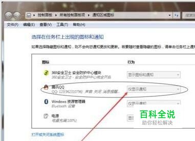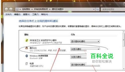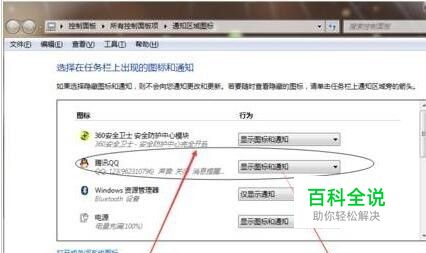 我们把对勾去掉,就可以设置各软件图标或消失是否显示了。我们设置QQ仅显示通知,侧走下角没有QQ图标,当有消息的时候会出现闪烁的头像通知。设置显示图标和通知,侧右下角会有图标显示,当有消息的时候也会有闪烁的头像通知,这样也是可以的。