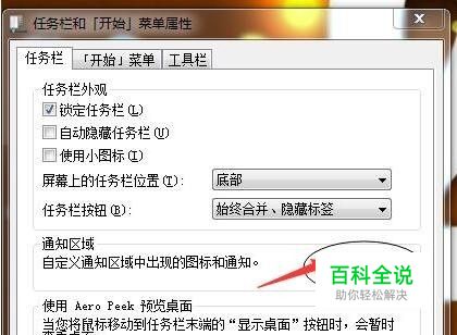 之后我们在左下角出现任务栏和开始菜单属性,如图所示。我们在任务栏下找到通知区域,自定义通知区域出现的图标和通知,点击自定义,进入设置界面: