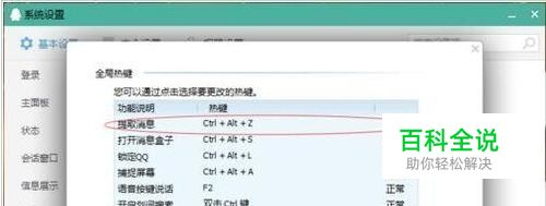 然后我们选择“设置热键”,进入热键设定,提取消息的热键是Ctrl+Alt+Z,我们也可以更改热键。有消息的时候直接按上Ctrl+Alt+Z就会出现会话框,当消息都提取完以后,再按就是出现主界面了。不管右下栏是否显示QQ图标,这个功能都可以使用,如图所示,注意请勿将快捷键与其他软件设置冲突,如果已有冲突快捷键,可以更改为其他快捷键: