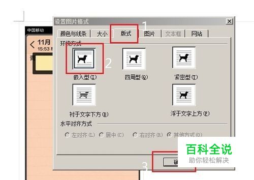 然后在弹出的设置图片格式属性对话框中,我们先切换到“版式”选项卡,然后在“环绕方式”下方选择“嵌入型”,完成之后,点击底部的“确定”即可,如下图所示: