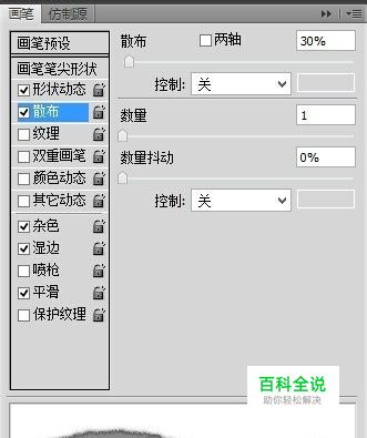 设置“散布”为338%,“数量”为5,“数量抖动”为11%,然后设置就完成了。