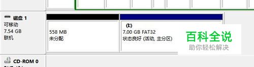 为了验证U盘的一部分空间被用来。打开磁盘管理。磁盘1中显示7.54G总大小,其中有558M空间未分配。