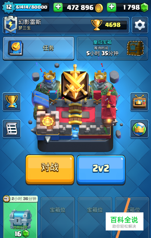 首先打开皇室战争,点击下图中箭头标注的位置。