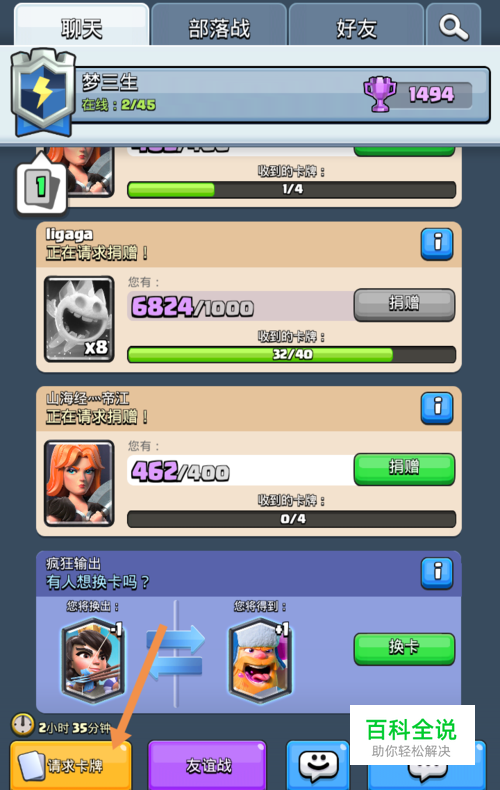 在换卡界面里,点击你想要的卡牌,然后点击请求。