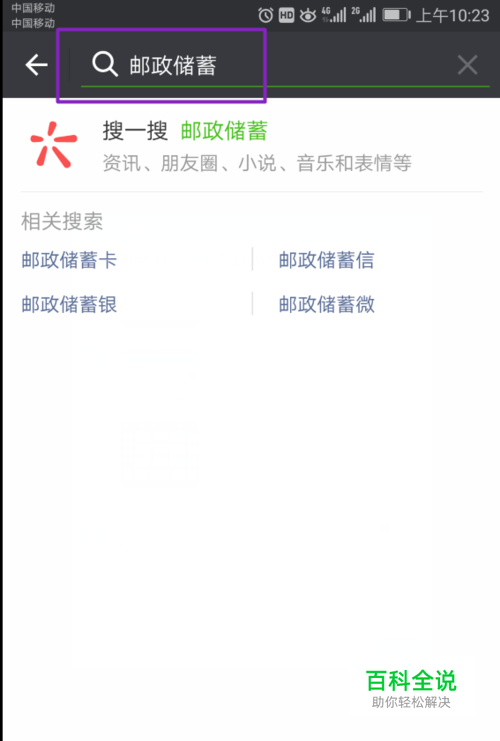 首先,我们打开微信,在微信中输入邮政储蓄进行搜索;