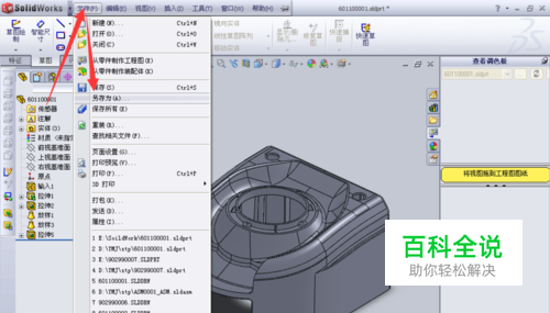 打开SolidWork软件,打开或者绘制图形,点击图示箭头