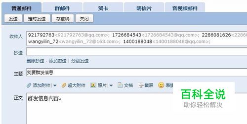 进入写信界面,发邮件主要填写内容有,收件人、标题、内容。