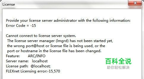 启动失败了,错误如下: Provide your license server administrator with the following information: Error Code = -15 Cannot connect to license server system. The license server manager (lmgrd) has not been started yet, the wrong port@host or license file is being used, or the port or hostname in the license file has been changed. Feature: ARC/INFO Server name: localhost License path: @localhost; FLEXnet Licensing error:-15,570 或者如截图: