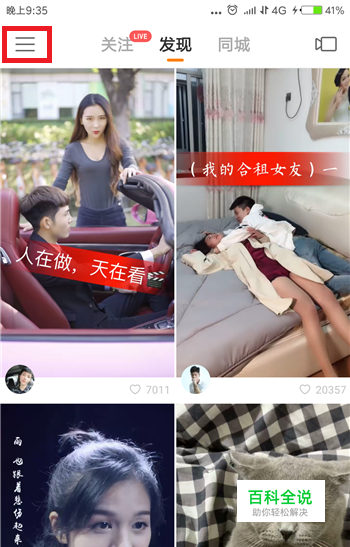 快手中删除说说必须在个人主页中找到发布的说说,打开快手并点击首页左上角的【三】选项。