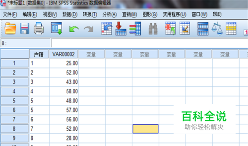 首先,我们登陆spss,进入spss,随便输入2组变量的数据用于分析,小编随便输入当作教程使用,如图。