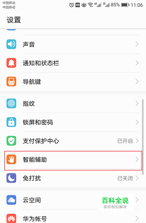 进入设置页面后,往下滑,找到智能辅助按钮,然后点击进入智能辅助页面。