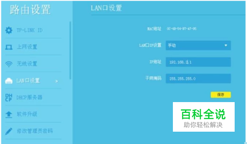把右边的“LAN口IP设置”改为“手动”,IP地址改为“192.168.2.1”(TP的默认IP地址是192.168.1.1,两个路由器的IP地址不能在同一个网段,所以那个2也可以改成其他的数字),点一下黄色的“保存”。