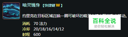 暗灵缠身 【W技能】 约里克在目标区域召唤一圈可破坏的暗灵之墙来阻挡敌方移动。 消耗 70 法力 冷却 20/18/16/14/12 射程 600 效果 约里克在目标区域召唤一圈可破坏的暗灵之墙(暗灵拥有2/2/3/3/4生命值),持续4秒。友方可以自由地穿过墙体。