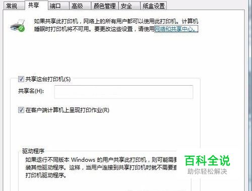 选择共享选项,在共享前面打勾,确认此打印机已经可以共享给其它电脑,最后点击确定。 很多时候,我们即使在同一个网络中,找到了打印机的电脑,却看不到共享打印机,它都没有共享,怎么看到它,所以第一个要确认的是它到底有没有共享。