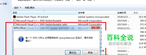 点击卸载后,这时弹出一个对话框“有一个WPS Office应用程序实例wpsupdate.exe在运行,请关闭后重试!”,如下图所示,我们叉掉对话框,接着按下面步骤操作。