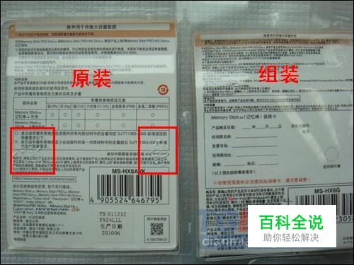 对比包装 1)首先看下包装,新版包装简明许多。因为组装的还没有及时更新,所以还是老版包装,但是老版原装的MS记忆棒也有在销售,所以大家如果不确定的话还可以参考《春节要小心 市场最新精仿索尼MS原装记忆棒》来鉴别。 2)注意背面的红框内原装的是打码的 3)再来看下印刷细节,原装和组装的印刷质量天壤之别啊…… 组装的就像低级盗版书一样,字体模糊粗糙 原装的字体细致 4)最后要注意的是原装MS记忆棒背面是贴纸的生产日期,而且还有二维码供识别 还有就是正面的防伪标签,殊不知新版的已经换样子了: 组装和老版的原装包装的防伪标签已经很像了 不但包装更新,新版MS记忆棒的防伪也跟新了
