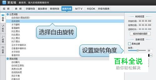 一、添加视频,把视频画面调正 首先,点击“视频”面板中的“添加视频”按钮,将视频导入爱剪辑。 接着切换到“画面风格”面板,选择“画面”选项卡中的“自由旋转”,根据视频画面的情况,在“角度”一栏设置旋转的角度,点击“添加风格效果”,视频就旋转过来啦,So easy!
