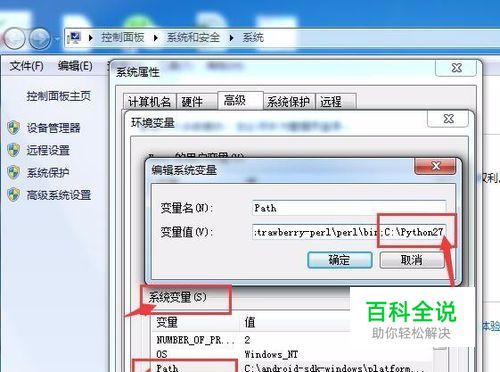 4. 在系统变量中找到Path,选中后点编辑,把Python的安装路径填写到变量值中,路径和前面路径用分号分隔开。变量设置好之后,点击确定后退出。