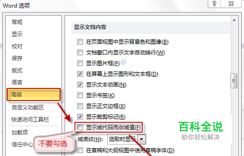 打开“ 高级”选项卡,找到并取消勾选“ 显示域代码而非域值”,按“ 确定”保存修改。
