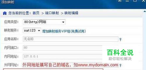 使用nat123,添加编辑使用端口映射,或添加编辑使用(动态)域名解析,外网地址使用自己的域名。同时记下自主域名提示地址。