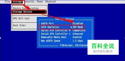 1. 开机按F10进入BIOS。在“Storage”选项中选择“Storage Options”回车 2. 找到“SATA Emulation”选项,使用键盘的方向键改为“IDE”或“AHCI”或“RAID”。按照需求更改即可。 3. 更改后按F10保存退出。