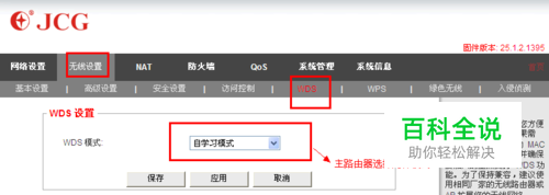 第一方案:自学习模式—中继模式 第一步:R1路由器设置 把R1和R2路由器都通电,连接好R1路由器,进入R1路由器设置页面——点击“无线连接”——点击“WDS”,在这里“WDS模式”选择“自学习模式”,然后点击“应用”,这样主路由器就设置完成了。