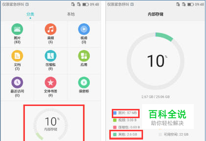 释放ROM内存 首先点击【文件管理】>【内部存储】,来看一下手机ROM内存里都塞了些什么吧。