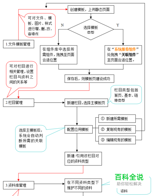 由图可以看出,网站建设共分为三个步骤:文件|模板管理→栏目管理→资料库管理。
