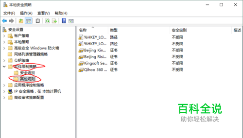 打开左侧软件限制策略,再打开下面的其他规则,最后将其他规则下的所有项目的安全等级改为不受限。