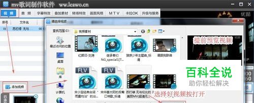 上一步骤点击“确定”之后,在视频,音频那一行中找到“MTV”的字样,在MTV中找到“导入LRC歌词”选择“导入LRC歌词文件”(文件先从网上下载到电脑桌面上),选择电脑中这首MV的歌词LRC格式文件,按“打开”添加歌词成功。