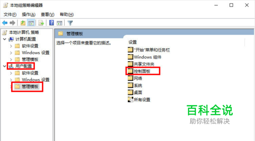 然后依次打开【用户配置】>【管理模版】>【控制面板】>【隐藏指定的“控制面板”项】,然后双击打开它。