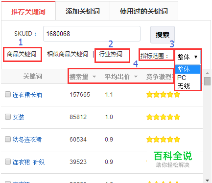 搜索关键词 我们可通过京准通后台添加关键词,在“推荐关键词”这里 1、商品关键词:系统根据输入的SKUID,为您推荐关键词,并给出相关数据。 2、指示范围:可选择查看不同端口或整体的推荐关键词数据。 3、行业热词:根据输入的SKUID判断该商品属于哪个类目,并推荐该类目下的热度关键词。 4、顺序选择:根据“搜索量”、“平均出价”、“竞争激烈程度”排名选择合适的关键词。