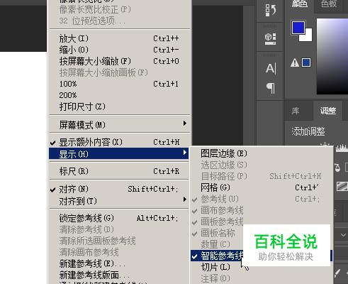下面举例演示智能参考线的用法。首先,要启用智能参考线。鼠标点击视图菜单,在下拉的菜单中再点:显示,再点:智能参考线。