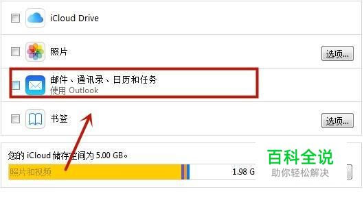 如下图,勾选“邮件、通讯录、日历、任务”